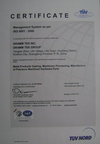 ISO/TS16949認證,為更好地為車廠提供汽車配件製造服務,本公司于2008年順利通過TUV及BSI認證TS技術規範,使得品質管制升級為技術規範來開展。